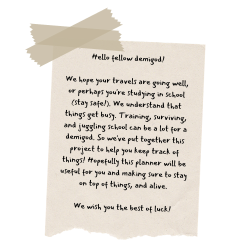 This planner will be centered around the PJO universe. The layout will be designed as an in-universe planner to be used by demigods on quests or in school. Specific spreads and trackers will be included based off of interest, however the planner in general will be kept as simple as possible. Demigods don't have much time to fill out dozens of planner pages when on the run.